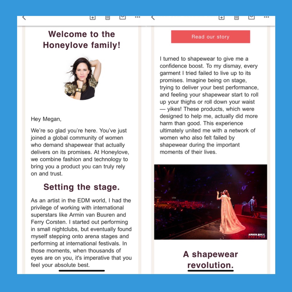With that however, with a subject line from Honey Love like “Welcome to the family, Megan” it struck me and I’m not opting out soon. The note is personal from the CEO as she explains her background from a long time back. As she shared about her career as a professional DJ she starts, I first wasn’t relating. This was until she shared her experience as a performer in front of thousands with her shape wear riding up, and most awfully, all us women know, rolling at the waist.